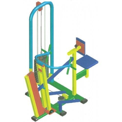 Fabricado em tubo retangular de 40x100x2 mm (base) Tubo 3'x2 mm e 2'x2mm (estrutura) e os demais tubos de 50x50x, 40x40x2 mm de espessura parte móvel roldanas de metal com durabilidade de 10 a 15 anos, com 80 Kg cada tipo tijolinhos guia dos tijolinhos zincado de 1'x2 mm, banco e encosto com espuma D28.
