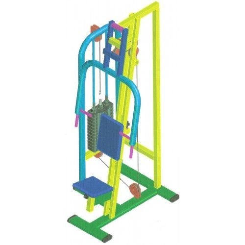 Fabricado em tubo retangular de 40x100x2 mm (base) Tubo 3'x2 mm e 2'x2mm (estrutura) e os demais tubos de 50x50x, 40x40x2 mm de espessura parte móvel roldanas de metal com durabilidade de 10 a 15 anos, com 80 Kg cada tipo tijolinhos guia dos tijolinhos zincado de 1'x2 mm, banco e encosto com espuma D28.